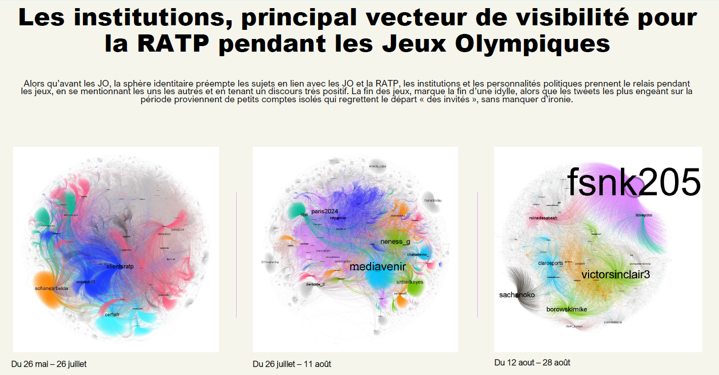 Dans ce contexte, RATP souhaiter veiller à son empreinte média et réseaux sociaux ainsi qu’à sa réputation. La mise en place du dispositif de veille spécifique dans le cadre des Jeux Olympiques et Paralympiques 2024 visait à suivre en temps réel toute publication mentionnant RATP pendant la durée des compétitions, et d’analyser les sujets émergents, communautés formantes et signaux faibles émanant des conversations en ligne, dans la presse et sur les réseaux sociaux.